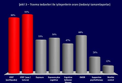 İlk iki kırmızı sütun Kontrol Odaklı Davranış Tedavisi ile deprem travması ve mültecilerde savaş ve işkence travması üzerine yaptığımız araştırmalarda iyileşen vakaların oranlarını göstermektedir. Görüleceği gibi, Kontrol Odaklı Davranış Tedavisi ile kanıta dayalı diğer travma tedavileri arasında belirgin farklılık bulunmaktadır. Diğer tedaviler vakaların %50’si civarında iyileşme sağlarken, Kontrol Odaklı Davranış Tedavisi’nde bu oranlar %90’lara ulaşmaktadır. Bu oranlar deprem travmasında çoğu zaman 1-2 seanslık tedaviyle, savaş ve işkence travmasında ise ortalama 6 seanslık tedaviyle sağlanmıştır. Bu tedavileri birbiriyle doğrudan karşılaştıran çalışmalar henüz yapılmadığı için bu bulgular kesinlik taşımamakla birlikte, yine de bir fikir vermesi bakımından anlamlıdır.