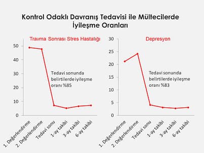Klinisyen Tarafından Uygulanan TSSH Ölçeği (Clinician-Administered PTSD Scale – CAPS) toplam skorları vakaların %70’inde 20’nin altında (hemen hemen tamamen iyileşme), %27’sinde 20 ile 39 arasında (hafif, eşikaltı TSSH), %3’ünde ise (2 vakada) 40 ile 59 arasında (orta derecede şiddetli TSSH) bulundu. Bu bulgular vakaların %97’sinin tedavi sonunda hemen hemen asemptomatik olduğu veya hafif TSSH belirtileri gösterdiği anlamına gelmekteydi. Tedavi sonunda vakaların işlevselliğini (end-state functioning) ölçmek için kullanılan bu ölçek üzerindeki skorların düşmesi ile travmanın sosyal, mesleki ve ailesel işlevleri üzerindeki olumsuz etkilerinde azalma arasnda yüksek korelasyon bulunmaktadır. Bu iyilik halinin tedavi sonrası yapılan takip görüşmelerinde uzun süre korunduğu görüldü. Bu bulgular savaş, işkence ve tecavüz travmalarında tedavinin etkili olduğunu gösterdiği gibi, mülteci olmanın getirdiği zor yaşam koşullarında bile tedavinin mümkün olduğunu göstermektedir.